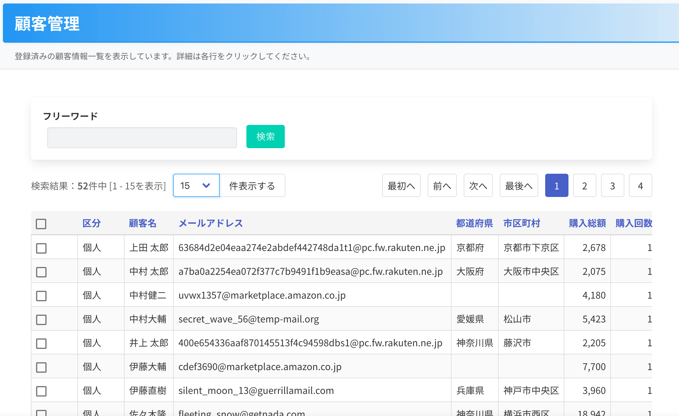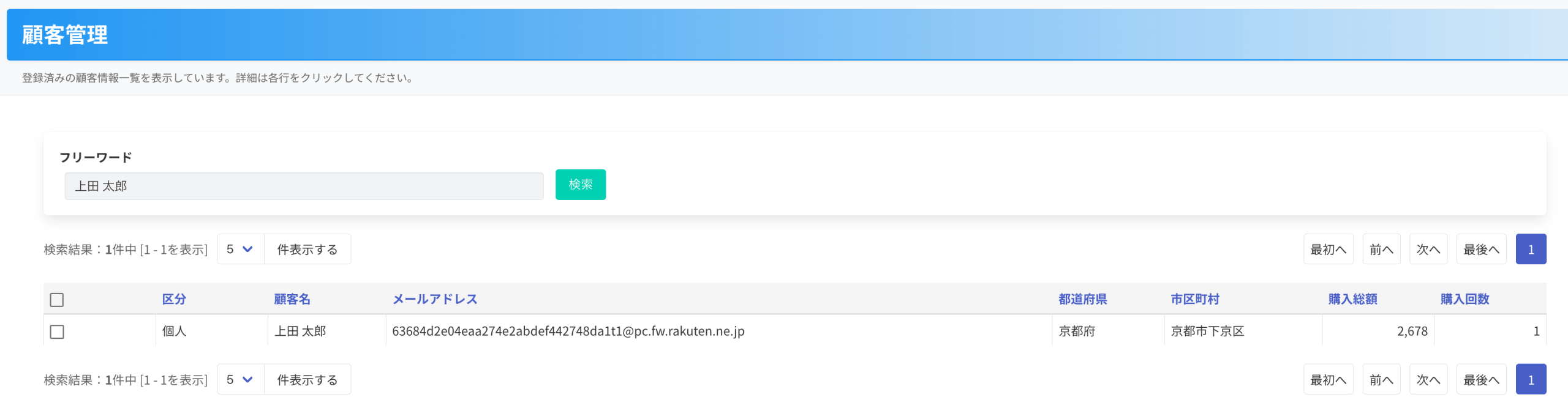 顧客情報の一覧表示では、フリーワードによる検索ができます。