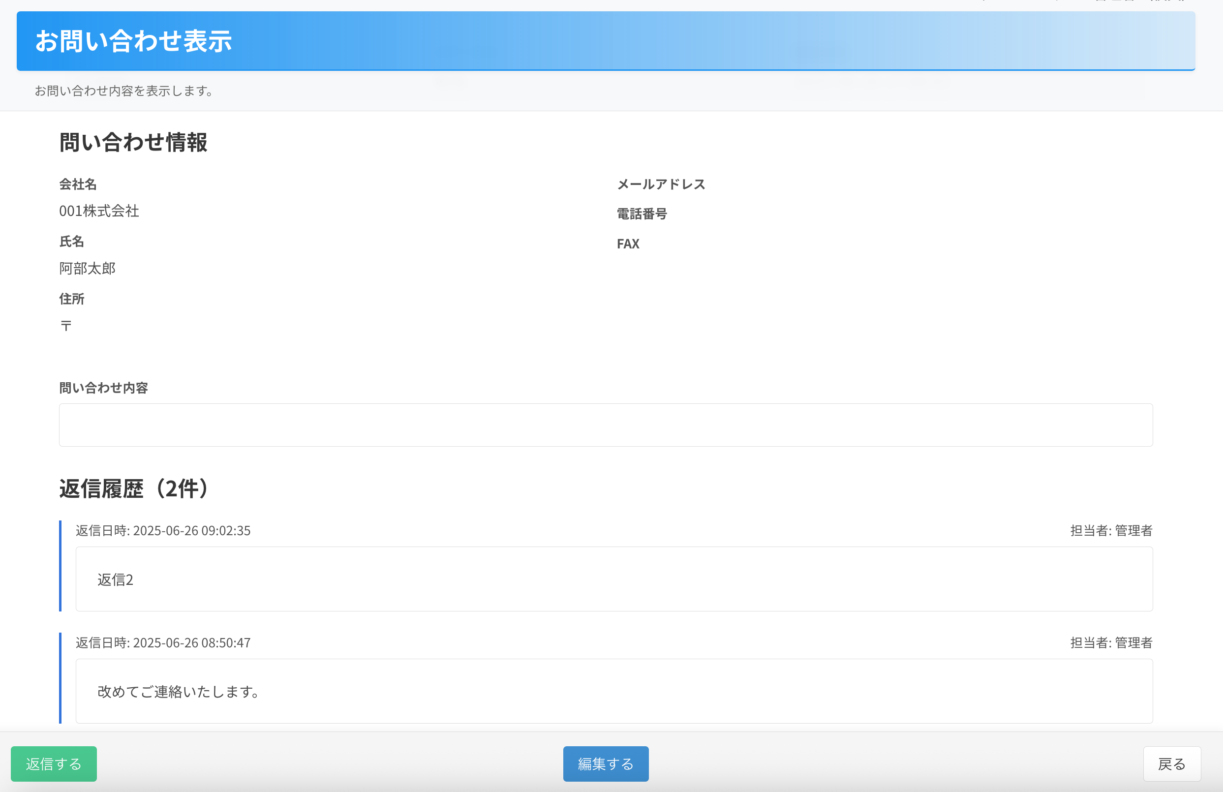 • 該当するお問い合わせ情報へのお問い合わせ返信管理ページ(返信一覧)が表示されます